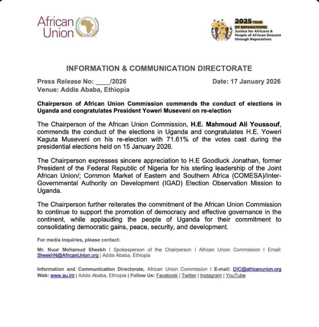 In a statement issued just two days after polling, AU Chairperson Mahmoud Ali Youssouf applauded Uganda’s electoral process, commending the leadership of the AU Observer Mission headed by former Nigerian President Goodluck Jonathan.