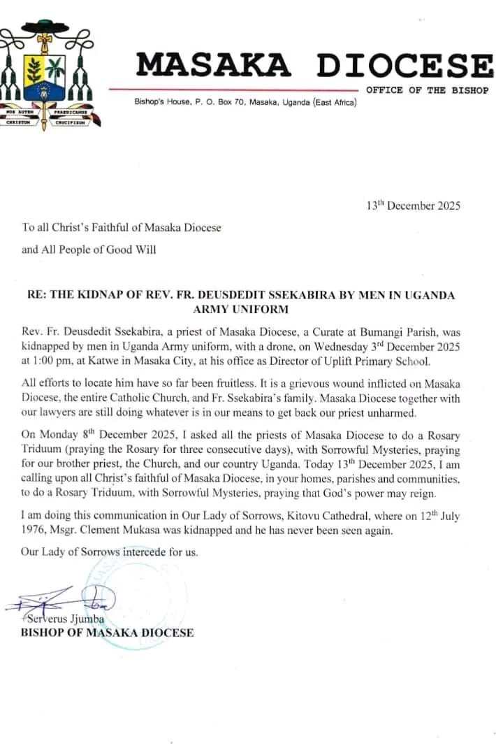 The Bishop of Masaka Diocese, Rt. Rev. Serverus Jjumba, has issued an emotional statement regarding the shocking disappearance  of Rev.Fr.Desdedit Ssekabira, who is alleged to have been abducted by people dressed in military uniform and whisked away in a drone earlier this month.