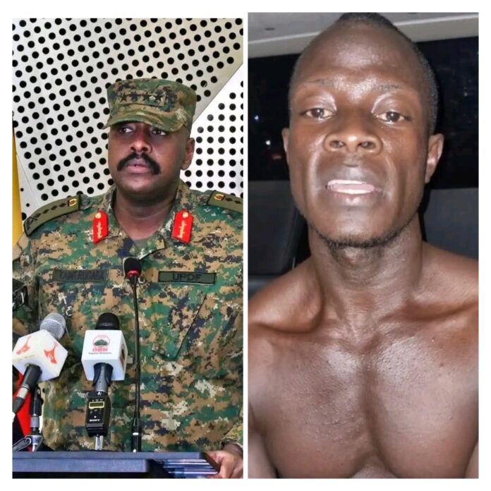 The image, shared on Muhoozi’s social media platforms, shows young shirtless male detainee seated under guard. The military chief claimed the suspect had urged violence against the ruling party NRM supporters a charge that has not yet been independently verified.