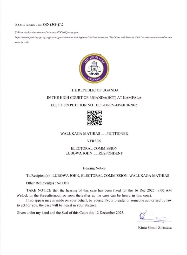 The High Court in Kampala has scheduled December 16, 2025, to hear an election petition filed by Walukaga Mathias against the Electoral Commission and its official, John Lubowa.