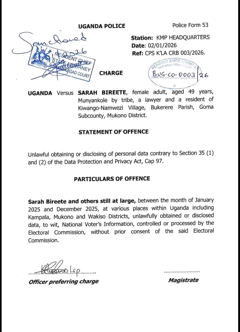 Renowned Ugandan human rights activist Sarah Bireete was on Friday arraigned before the Buganda Road Court and charged with unlawfully accessing and disseminating information related to the voters’ register without authorization from the Electoral Commission.