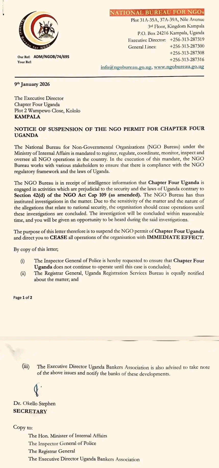 The decision, signed by Dr. Okello Stephen, Secretary to the NGO Bureau, aligns with the Bureau’s mandate to regulate, monitor, and oversee NGOs across Uganda.
