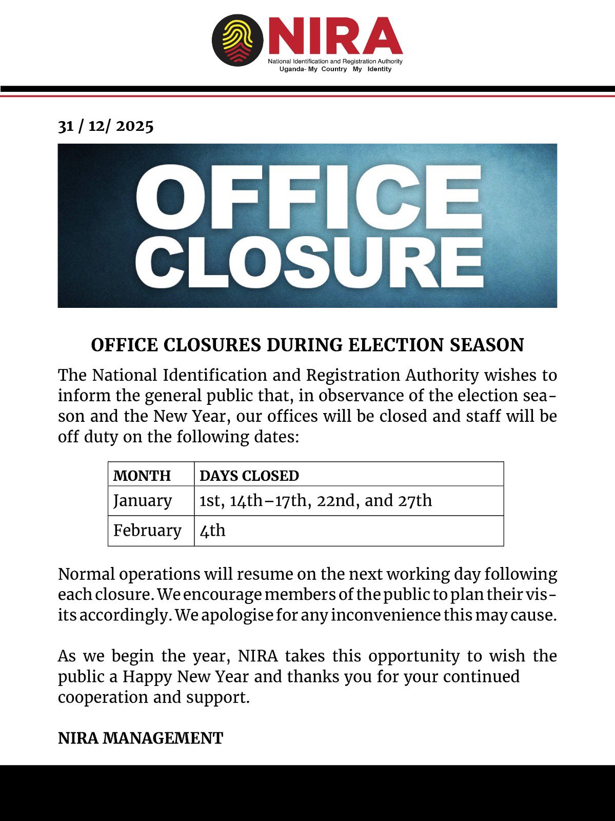 According to an official update from NIRA, all registration equipment currently deployed at sub-counties will be withdrawn and returned to NIRA offices. In addition, NIRA offices across the country will remain closed on January 14, 15, and 16.