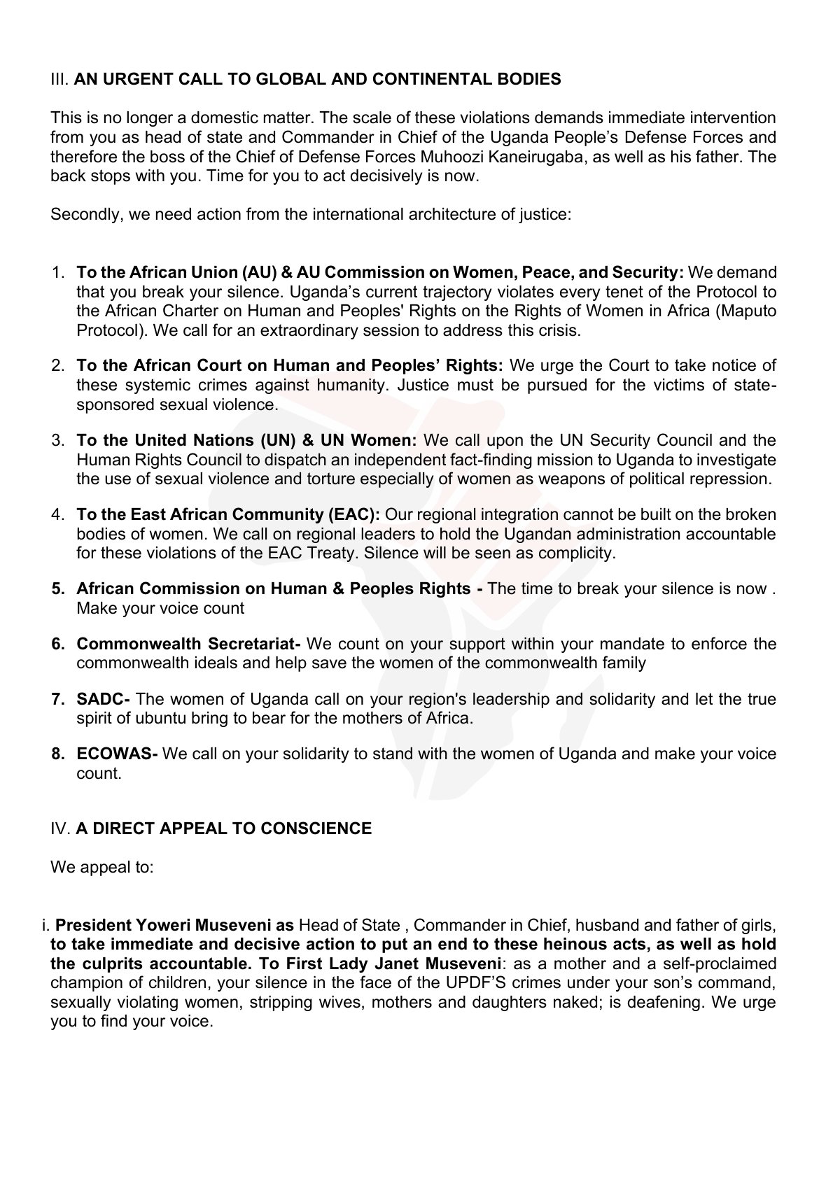 According to the letter, women linked to opposition figures and dissenting voices have become deliberate targets in what is described as a calculated campaign of political repression. The authors argue that sexual violence has been weaponised to punish, intimidate and silence perceived opponents of the state.