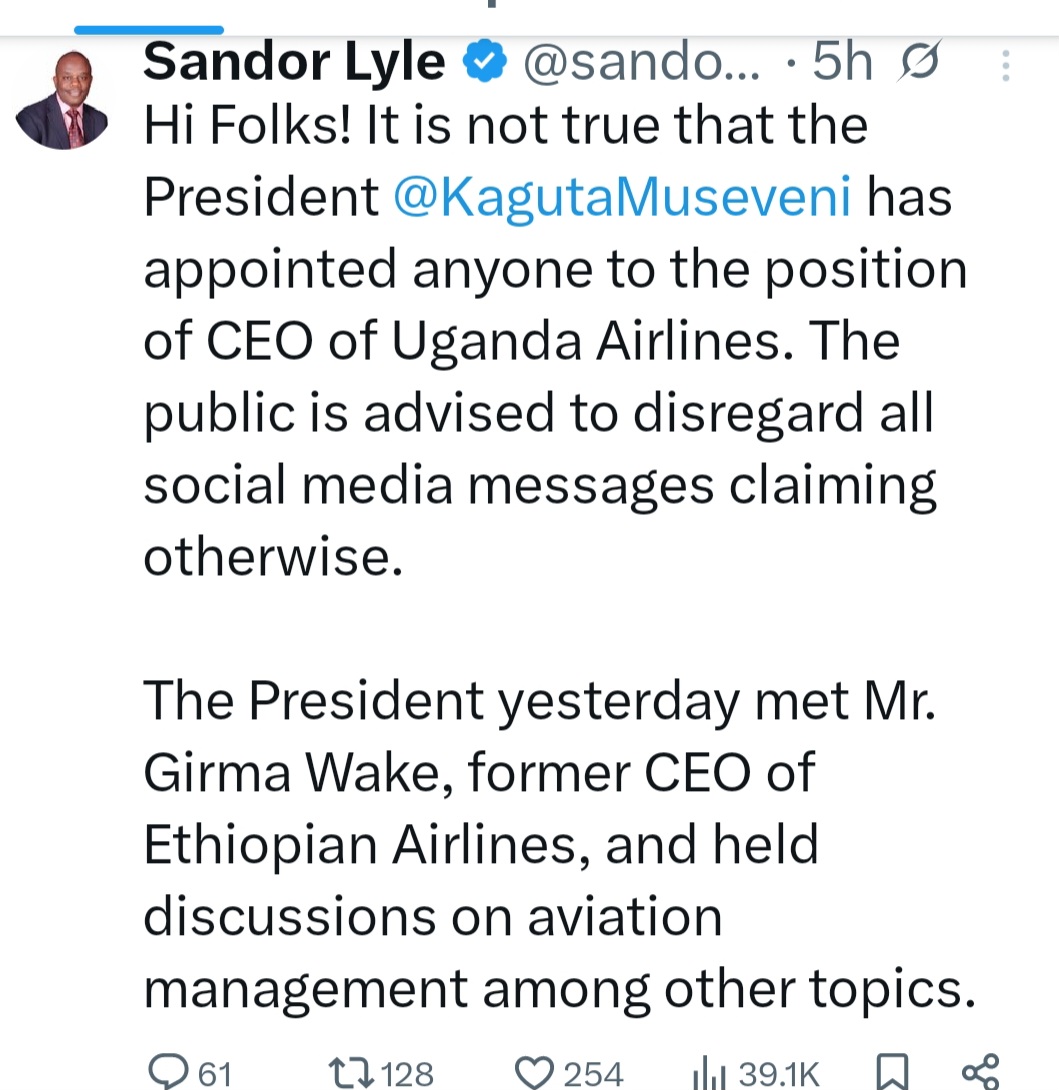 For now, government maintains that Girma Wake has not been appointed to any leadership position at Uganda Airlines, and any official changes will be communicated through proper channels.