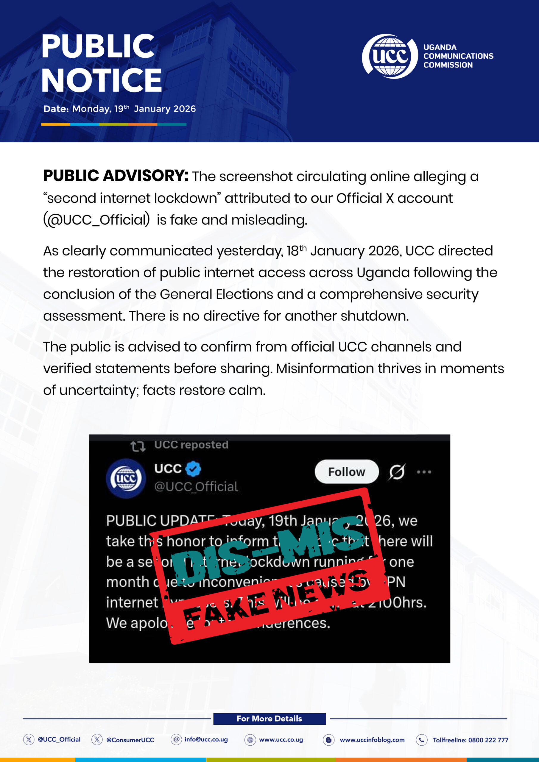 UCC urged Ugandans to rely only on official communication channels for verified updates, especially amid ongoing post-election tension, insisting that no new internet shutdown has been announced.