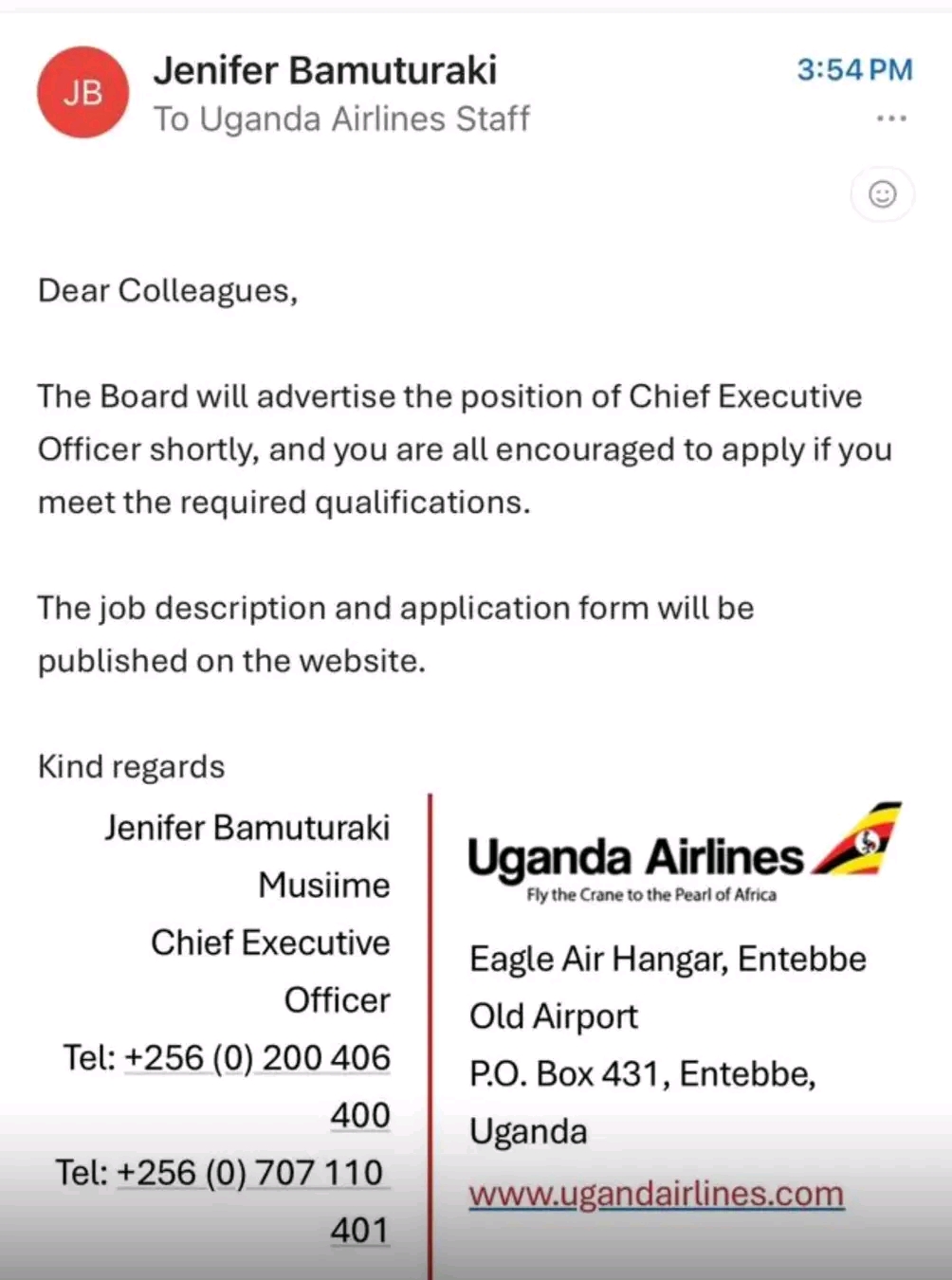 In an internal communication to staff, Bamuturaki announced that the airline’s board had resolved to re-advertise the CEO position, encouraging qualified internal and external candidates to apply. Her message, circulated alongside her official portrait and company details, signals the end of her tenure at the helm of the airline.
