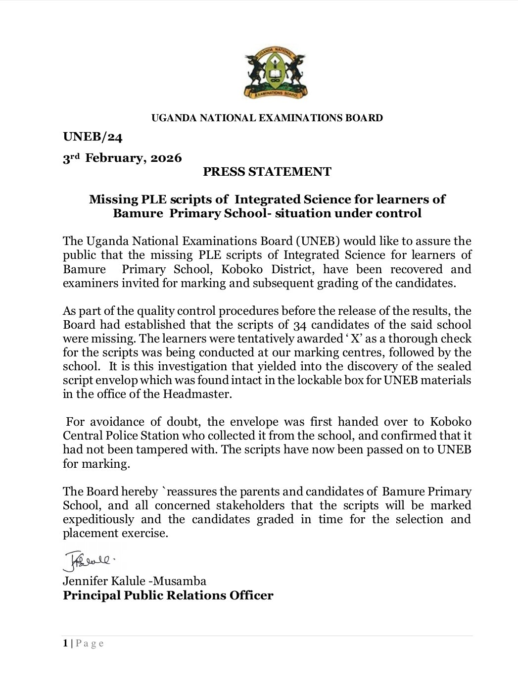 The Uganda National Examinations Board (UNEB) has confirmed the recovery of 34 missing Primary Leaving Examination (PLE) Integrated Science scripts from Bamure Primary School in Koboko District, easing fears over the fate of affected candidates.